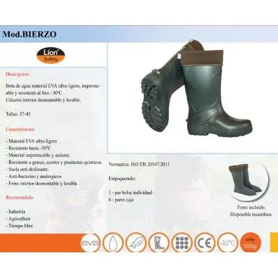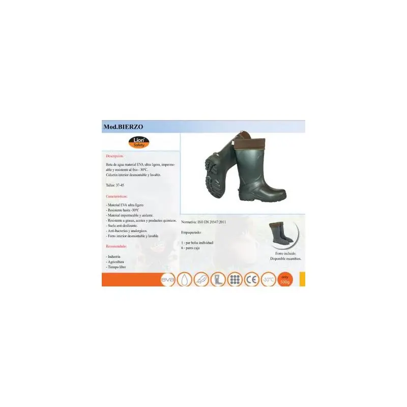 Bota alta de agua material EVA ultra ligera, flexible y resistente a la suciedad (grasas, aceites...) Anti-bacterias y analergicos. Suela anti-deslizante. Plantilla interior extra-confort.